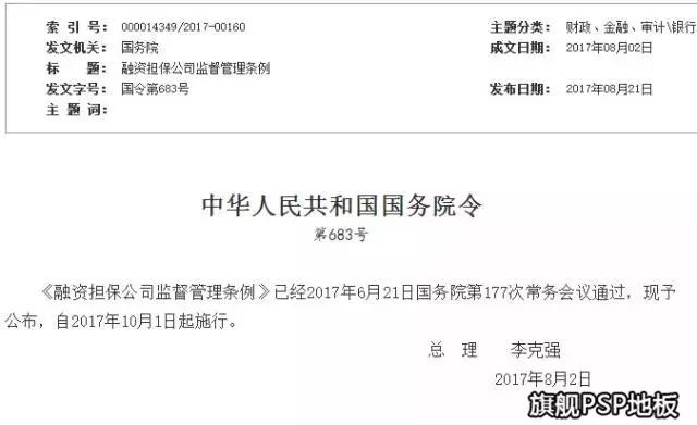 為了規范融資擔保公司的行為,防范風險,2017年8月2日,國務院總理李克強簽署國務院令683號,公布《融資擔保公司監督管理條例》(以下簡稱條例),自2017年10月1日起施行。