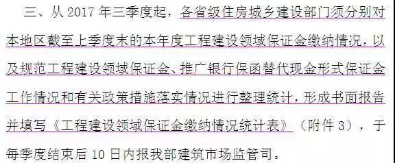 日前住建部發布建辦市函[2017]460號文,明確要求各省級住房城鄉建設部門須每季度要把推廣銀行保函替代現金形式保證金工作情況和有關政策措施落實情況進行整理統計,形成書面報告,進行上報,意思也很明確:各省要加快推廣銀行保函替代現金形式保證金。