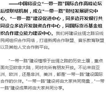 ——中國愿在和平共處五項原則基礎上,發展同所有“一帶一路”建設參與國的友好合作。中國愿同世界各國分享發展經驗,但不會干涉他國內政,不會輸出社會制度和發展模式,更不會強加于人。我們推進“一帶一路”建設不會重復地緣博弈的老套路,而將開創合作共贏的新模式;不會形成破壞穩定的小集團,而將建設和諧共存的大家庭。