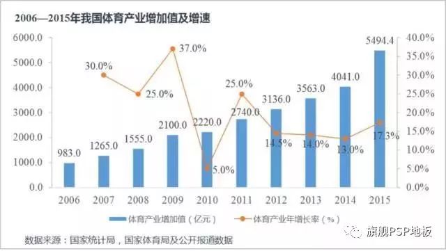近十年來,我國體育產業增加值從2006年的983億增長至2015年的5494.4億,平均每年增速為21.1%,且持續增長態勢明顯。