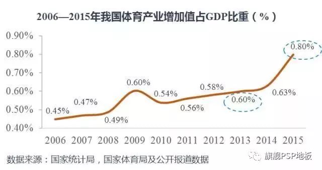 國家體育總局和統計局聯合發布的公告顯示,2015年國家體育產業總產出(總規模)為1.7萬億元,增加值為5494億元,占同期國內生產總值的比重為0.8%。