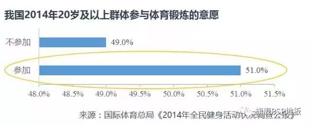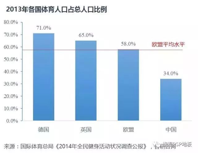 2014年我國體育人口占比為34%,低于歐盟平均水平的58%。雖然我國龐大的人口基數一定程度上會拉低比例,但與歐盟“全民健身”的市場局面相比,差距則驟然顯現。