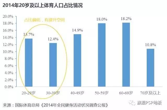 在20-69歲之間呈現出隨年齡增大體育人口比例逐步增加的趨勢。20-39歲體育人口占比偏低,有較大提升空間。