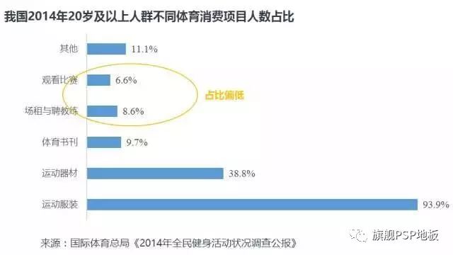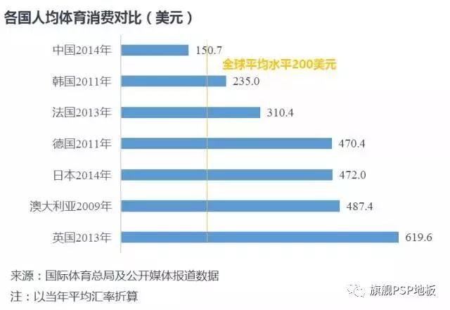 2014年我國人均體育消費926元,約151美元,低于全球平均水平200美元,且僅為英國(2013年)的四分之一。