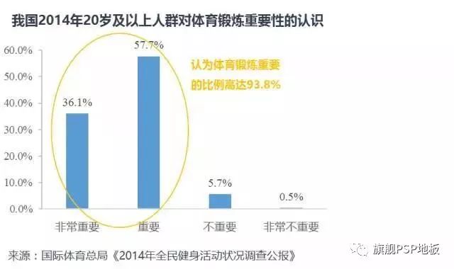 2014年20歲及以上人群中,大部分人都認為體育鍛煉重要,占比93.8%。其中,36.1%認為“非常重要”,而認為不重要的僅占6.2%。
