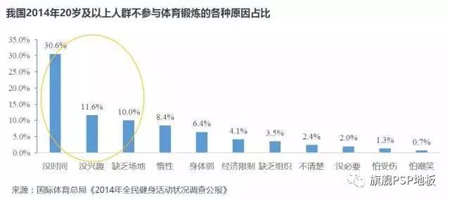 在20歲及以上不參與體育鍛煉的人群中,沒時間占比30.6%,沒興趣占比11.6%,缺乏場地占比10.0%。