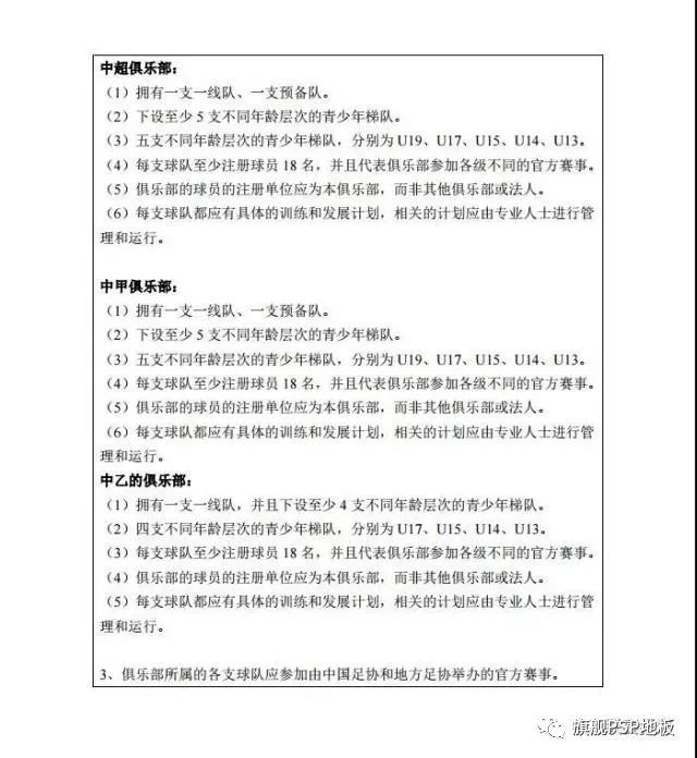 12月21日訊 北京時(shí)間今日,中國足協(xié)發(fā)布了關(guān)于印發(fā)《中國足球協(xié)會職業(yè)俱樂部準(zhǔn)入規(guī)程》的通知,規(guī)定中超、中甲球隊(duì)須有5支梯隊(duì),中乙球隊(duì)4支梯隊(duì)。